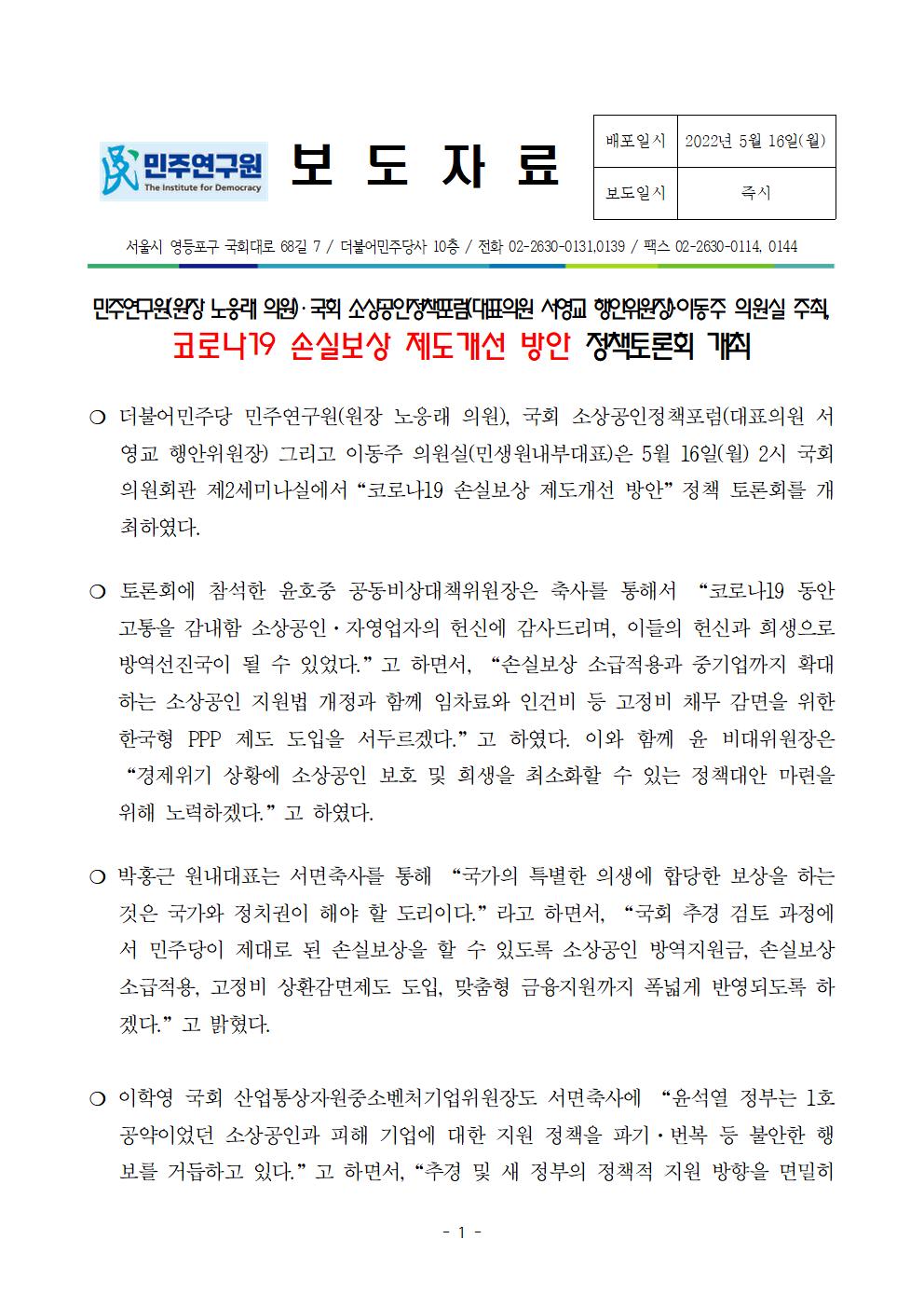 [보도자료]민주연구원, 코로나19 손실보상 제도개선 방안 정책토론회 개최(사전)