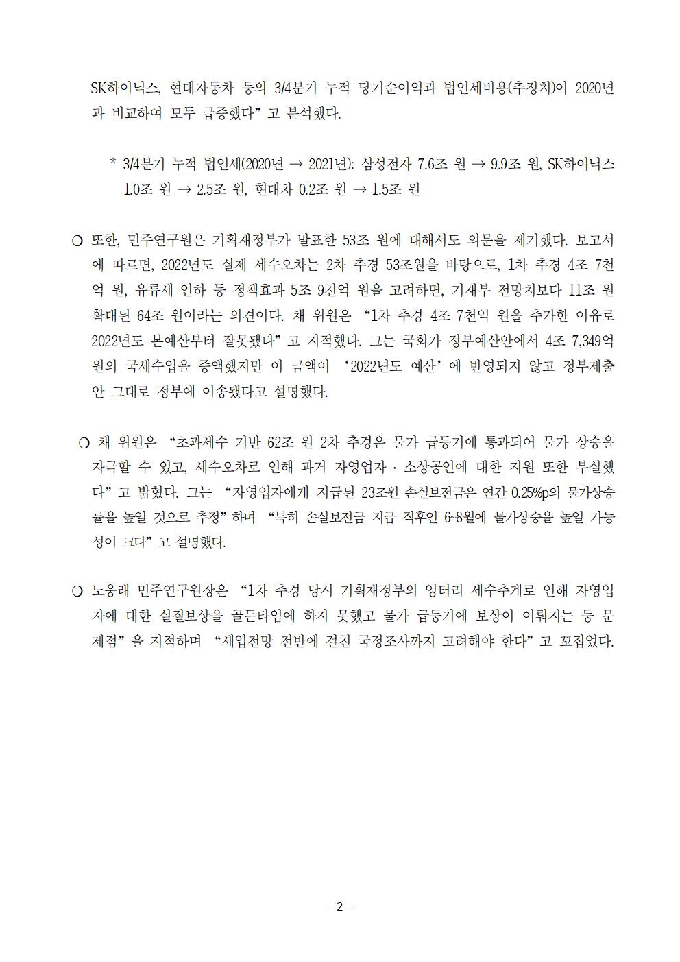 [정책브리핑 및 보도자료] 더불어민주당 민주연구원, 국민 1인당 124만원의 세수오차. 무능인가, 기획인가