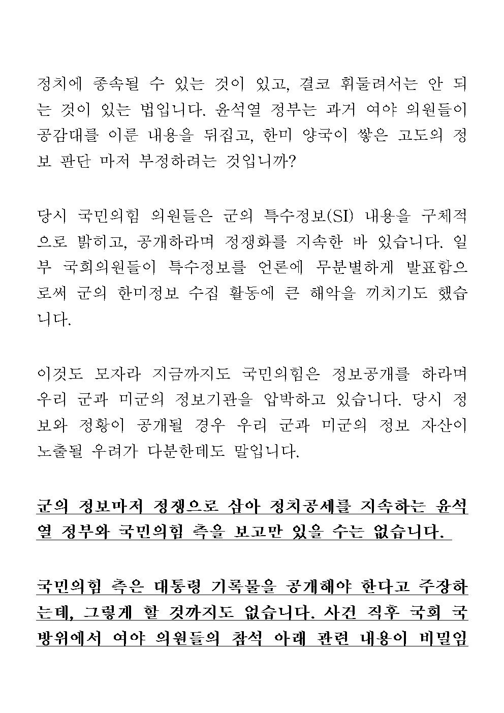 [기자회견문] 더불어민주당 전반기 국방위원 일동, 정치가 모든 것을 흔들 수는 없습니다. 윤석열 정부는 정쟁에 이용할 수 없는 것도 있음을 명심하기 바랍니다