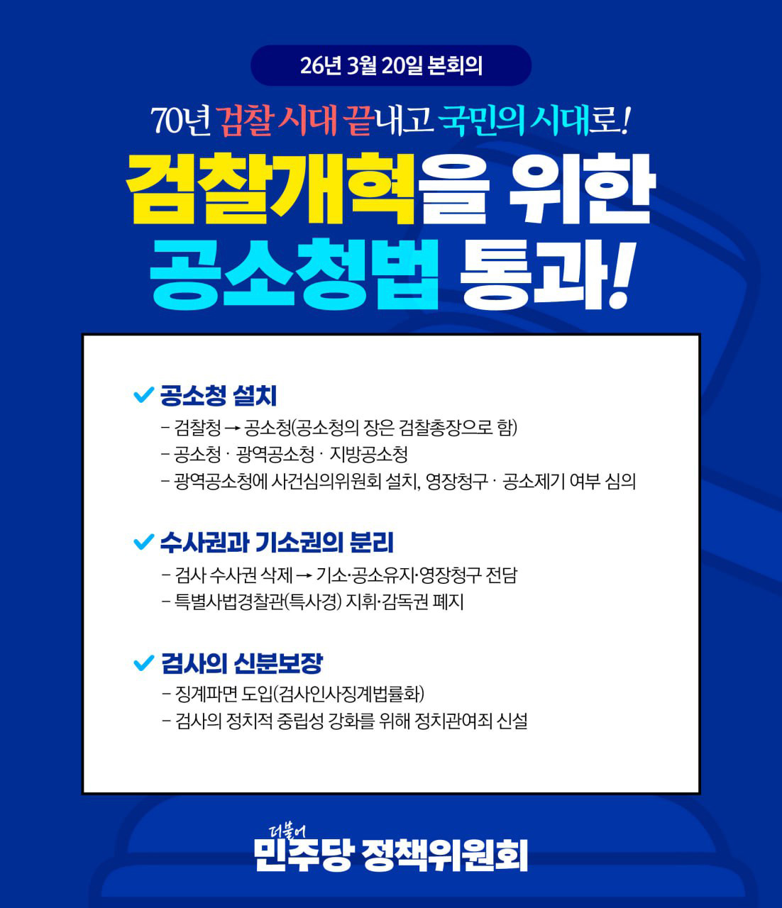 70년 검찰 시대 끝내고 국민의 시대로! 검찰개혁을 위한 공소청법 통과!<26.03.20 본회의>