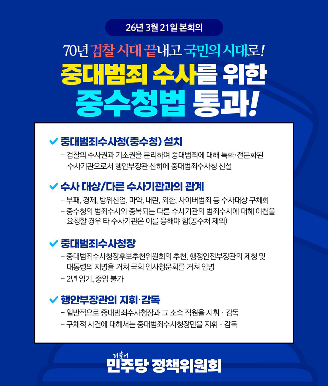 70년 검찰 시대 끝내고 국민의 시대로! 중대범죄 수사를 위한 중수청법 통과!<26.03.21 본회의>
