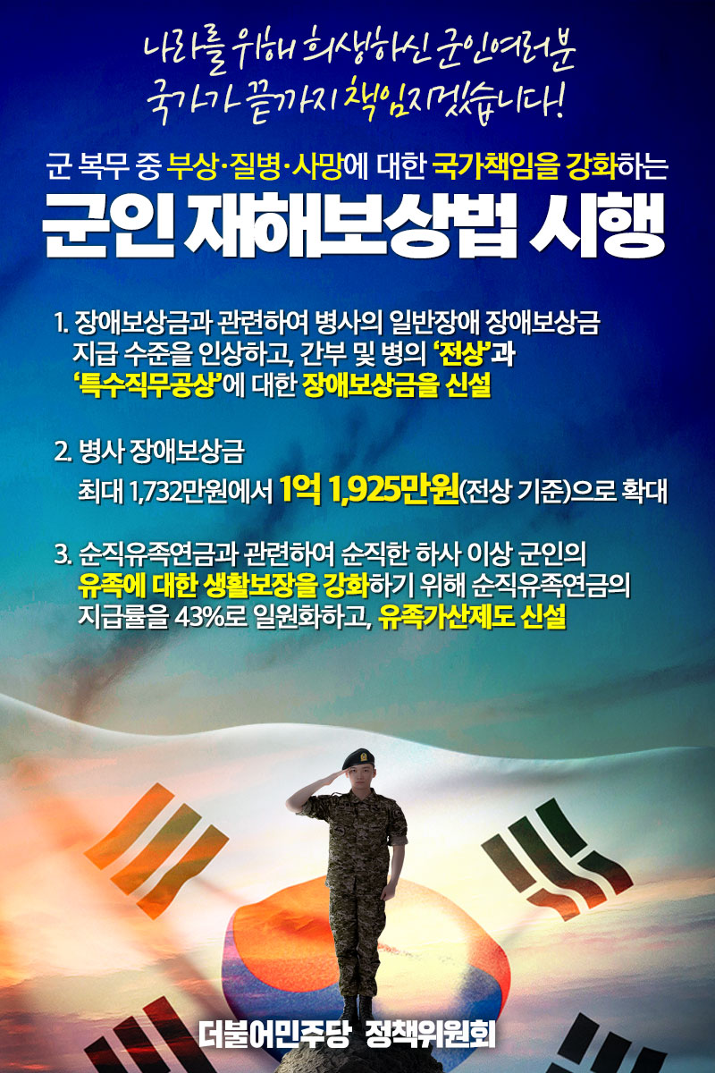 군 복무 중 부상·질병·사망에 대한 국가책임을 강화하는 군인재해보상법 시행