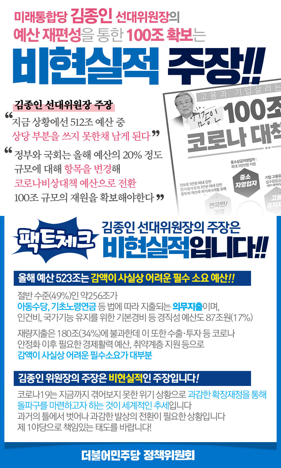 미래통합당 김종인 선대위원장의 100조 확보는 비현실적 주장!