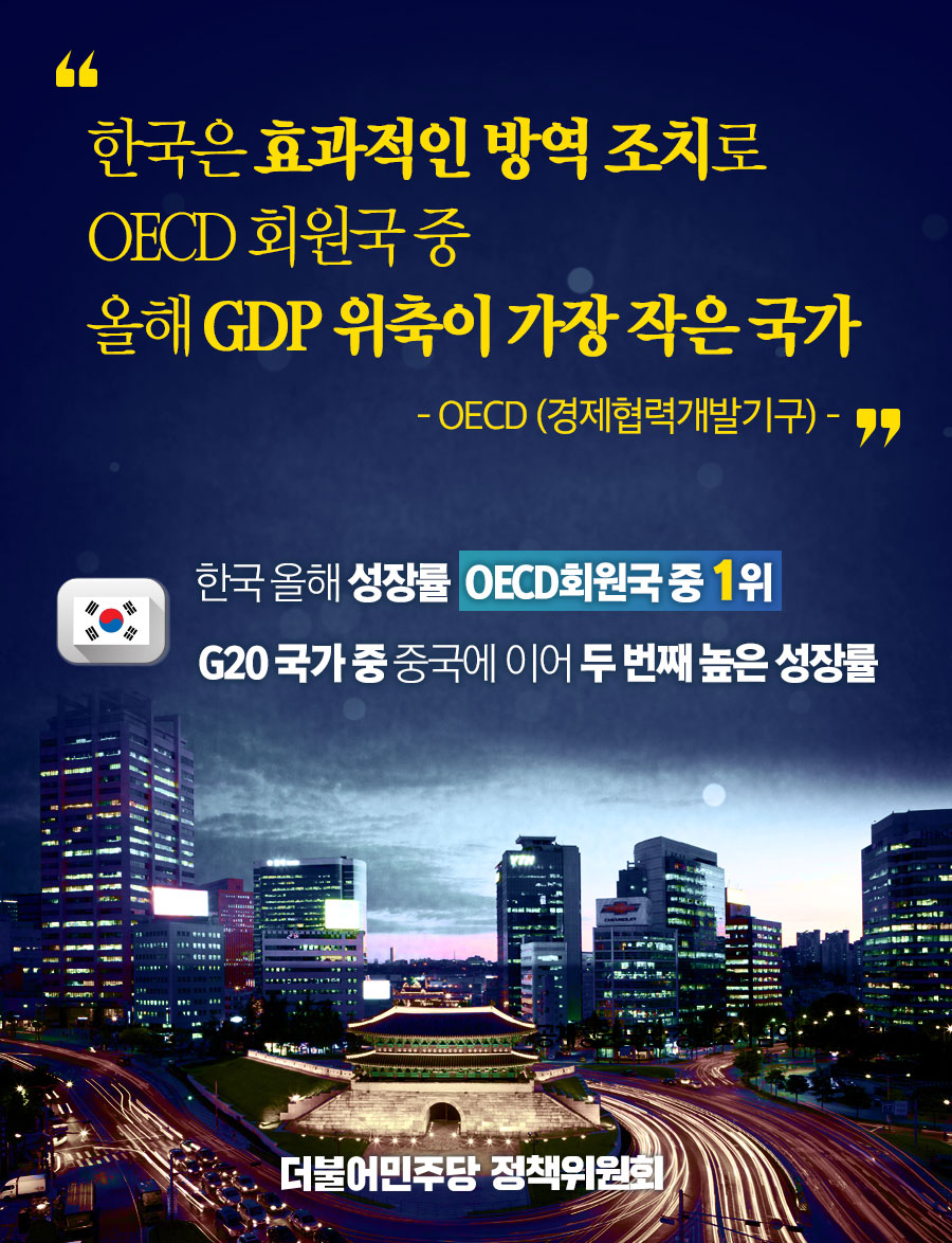 한국은 효과적인 방역 조치로 OECD회원국 중 올해 GDP 위축이 가장 작은 국가