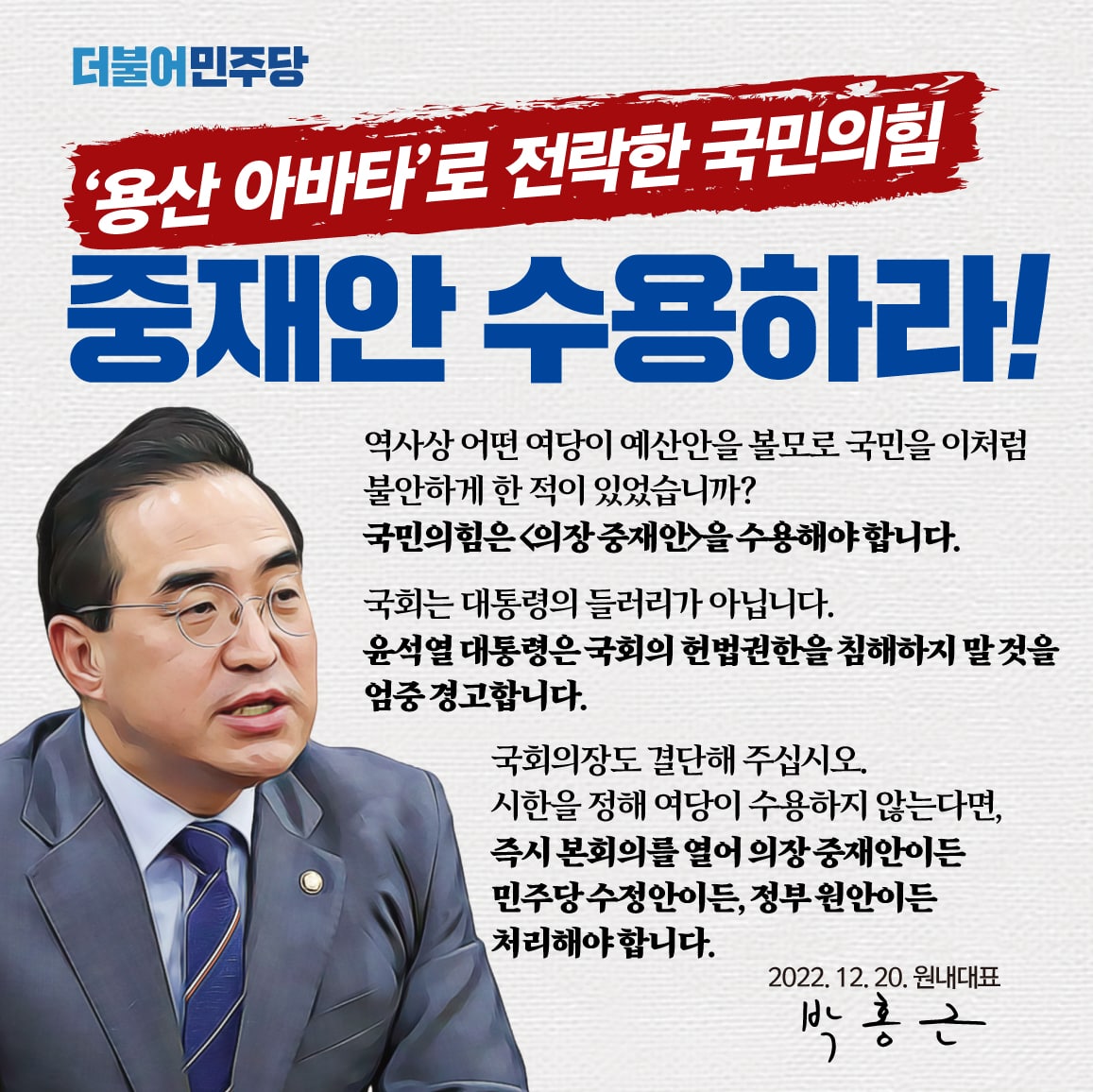 '용산 아바타'로 전락한 국민의힘 중재안 수용하라!