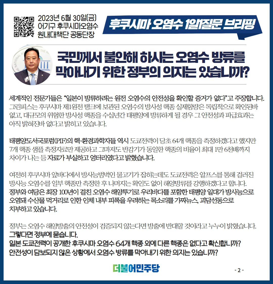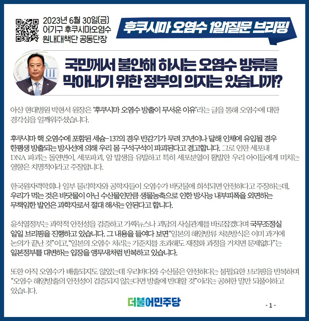 23.6.30 후쿠시마 오염수 1일 1질문 브리핑