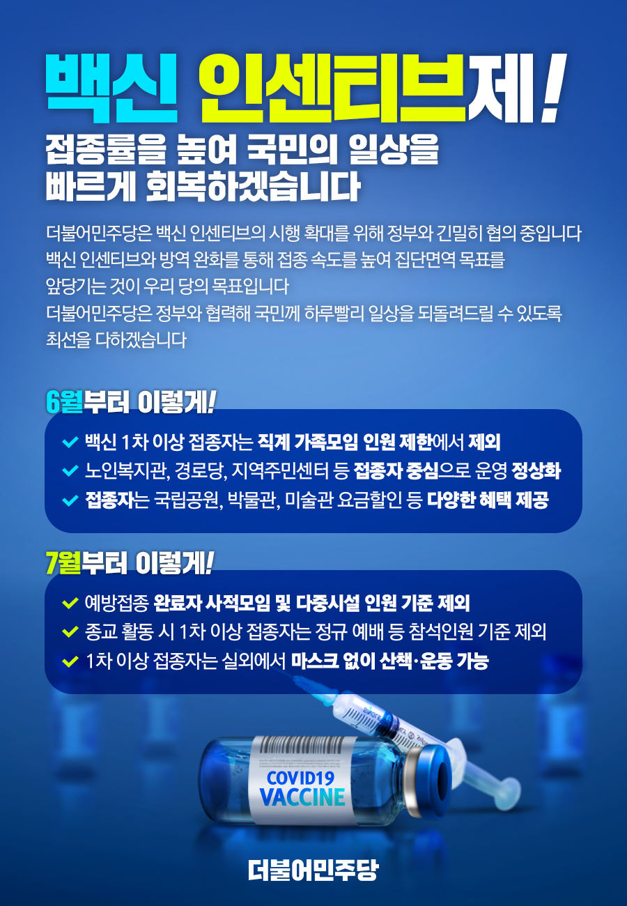 백신 인센티브제! 접종률을 높여 국민의 일상을 빠르게 회복하겠습니다.