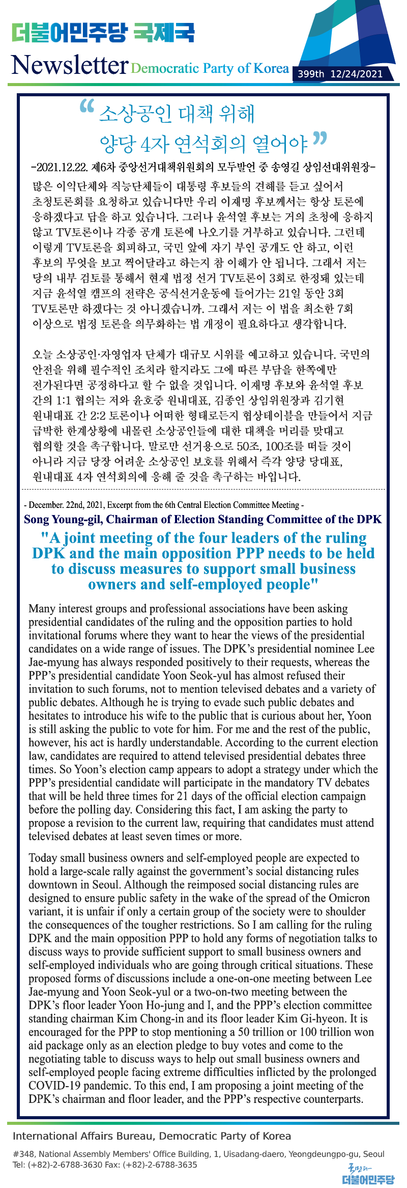 [400th Newsletter]Excerpt from remarks by DPK Presidential Candidate Lee Jae-myung supporting