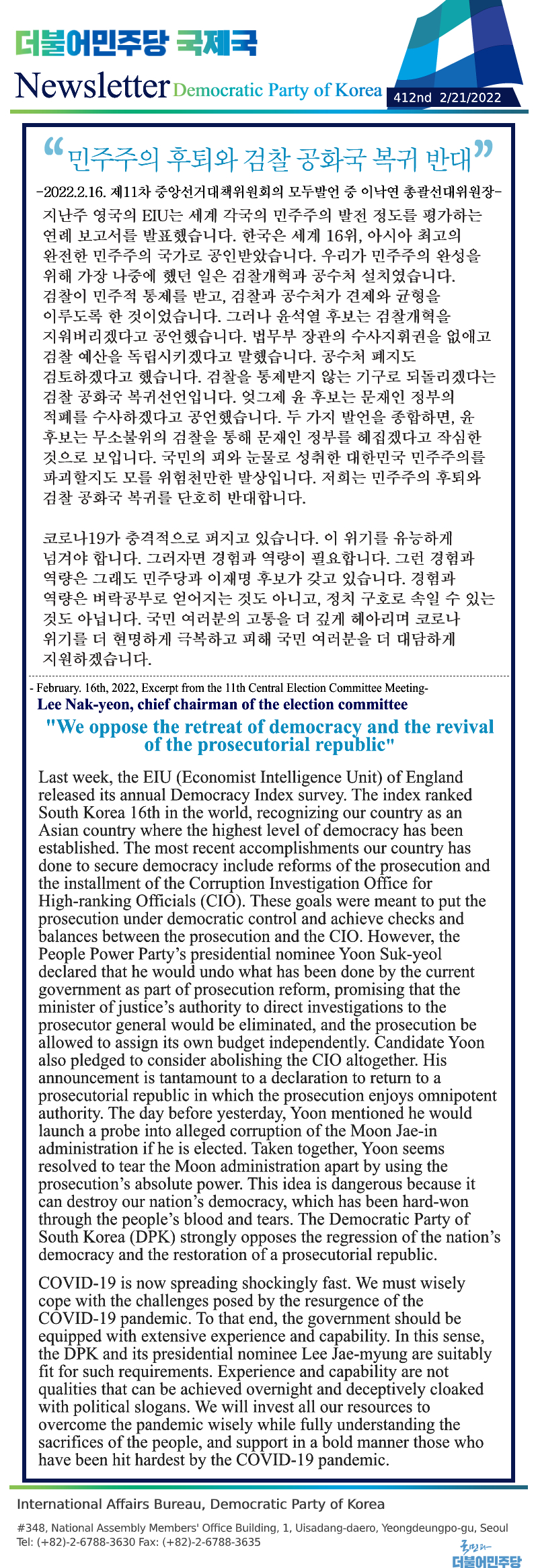 [412nd Newsletter]Excerpt from the 11th Central Election Committee Meeting
