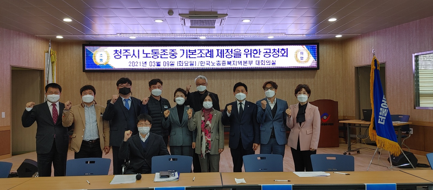 더불어민주당 충북도당(위원장 이장섭 국회의원)이 9일 한국노총 충북지역본부와 공동 주최로 ‘청주시 노동존중 기본조례 제정을 위한 공청회’를 한국노총 충북지역본부 회의실에서 개최했다.