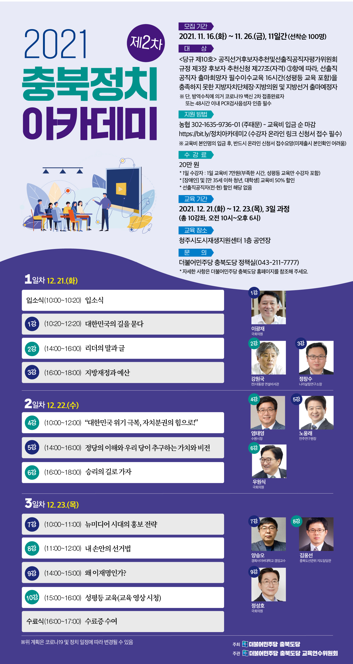 제2차 충북 정치아카데미는 12월 21일부터 12월 23일까지 총 3일 동안 10강좌(16시간)로 구성되어 운영된다.[※ 수강료 20만원, 단, (장애인) 및 (만35세 이하 청년, 대학생) 50%할인, 선출직 공직자(전·현) 할인 해당 없음, 반드시 본인명의로 입금 후 온라인 신청 필수]