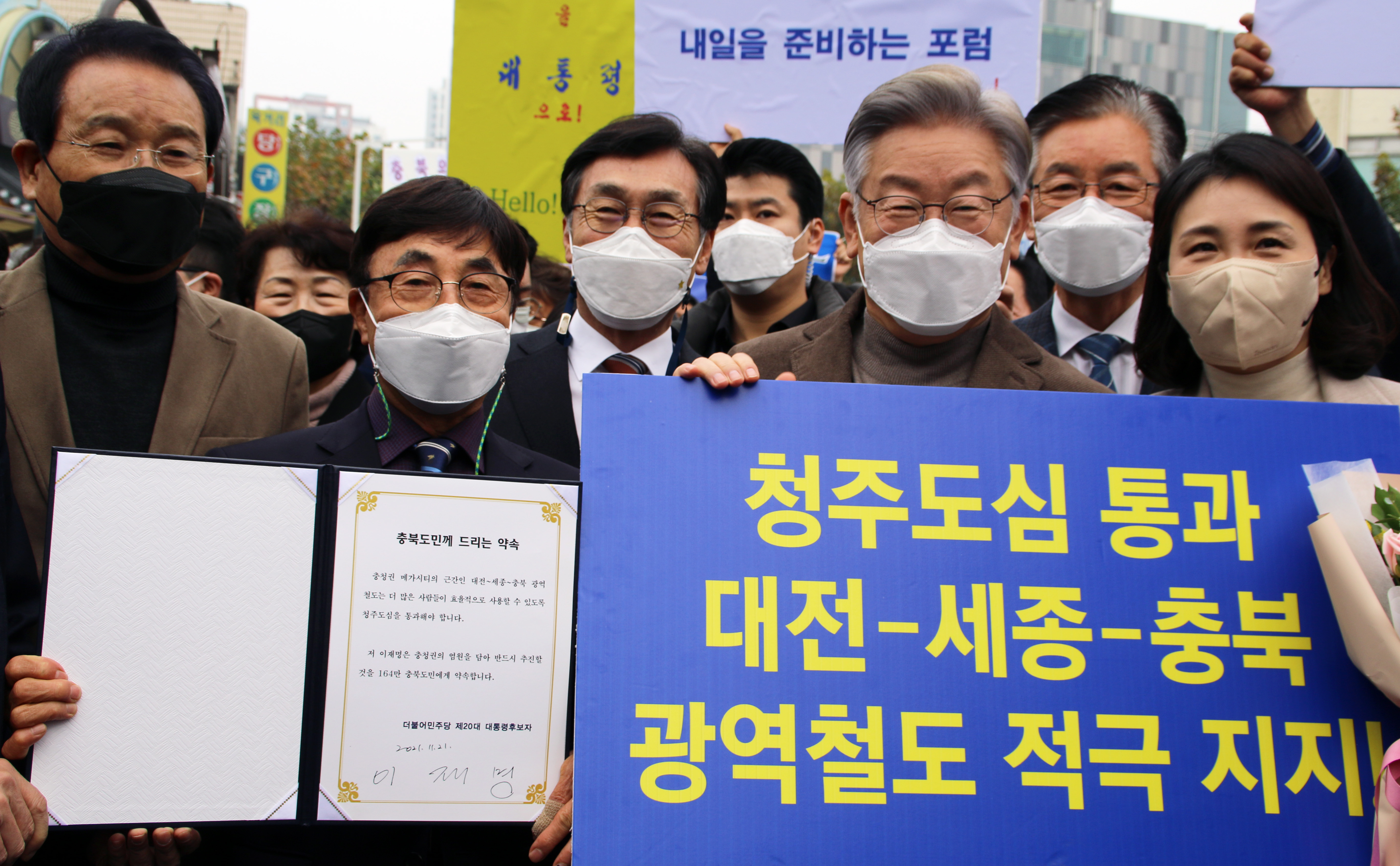 수 많은 인파와 지지자들이 모여 집중하는 가운데, 충청권 메가시티의 근간인 대전~세종~충북 광역철도는 많은 사람들의 효율적 사용이 가능해짐과 동시에 청주시 발전의 핵심으로 청주 도심 통과를 충청권의 염원을 담아 반드시 추진할 것을 164만 충북도민과의 약속이 담긴 서명서에 서명했다.