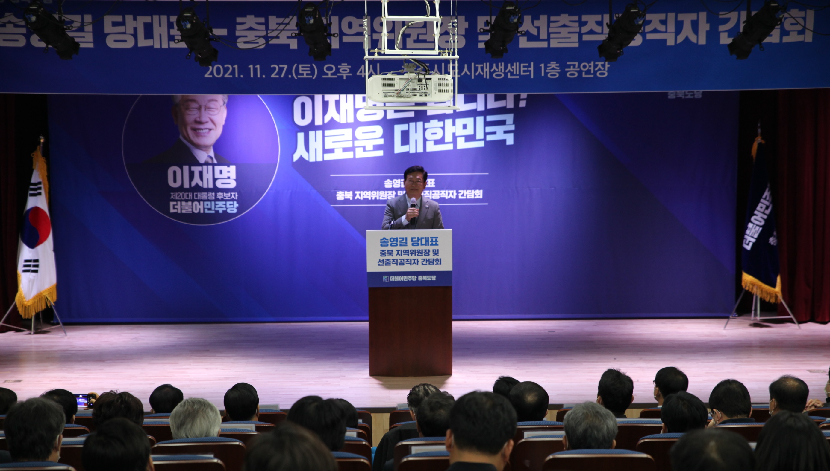 더불어민주당 송영길 당대표는 27일 청주시도시재생지원센터 1층 공연장에서 충북도당(이장섭 도당위원장)이 준비한 충북 지역위원장 및 선출직 공직자 간담회에 참석해 2022년 대선과 지방선거 필승에 대한 각오와 결의를 다졌다.