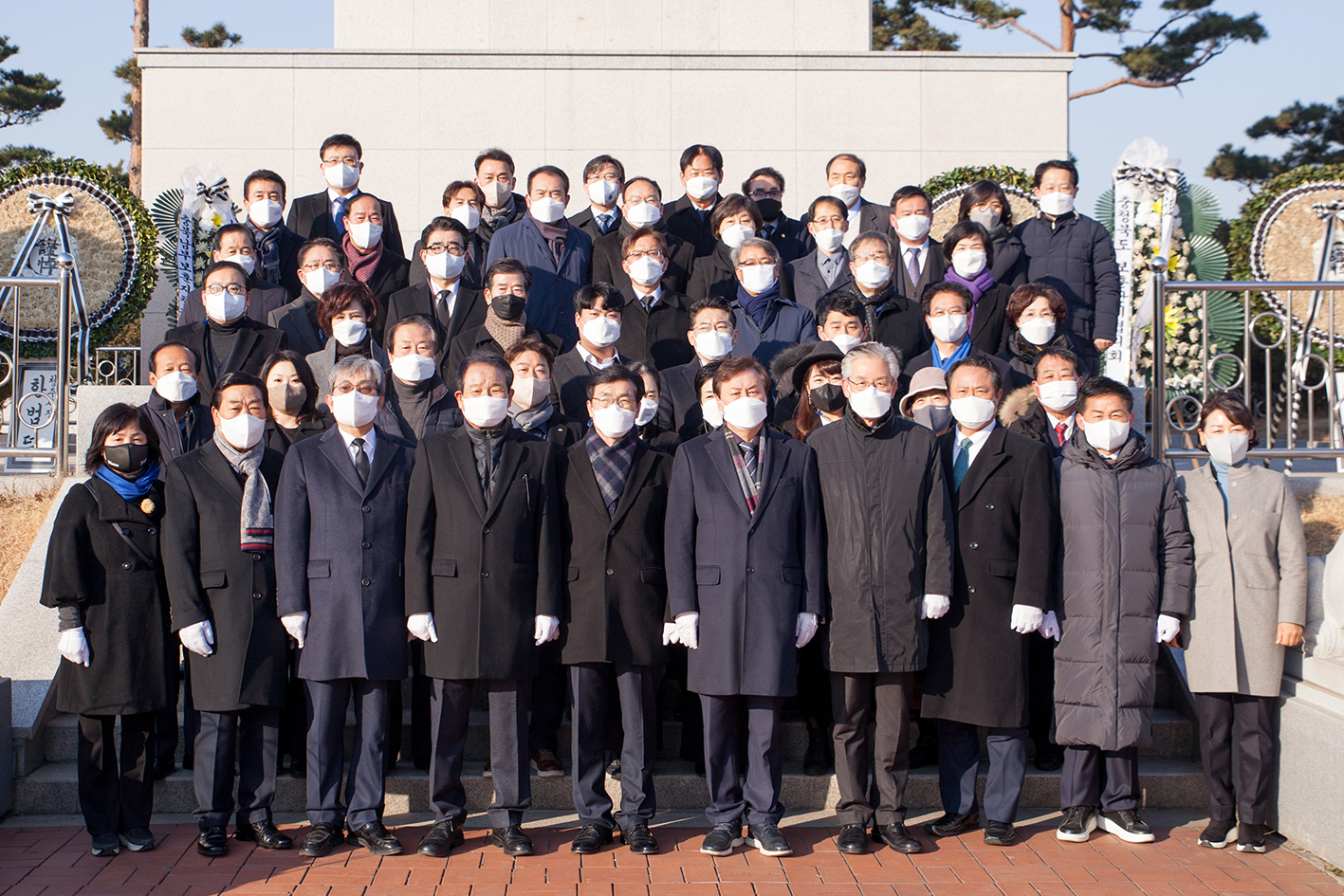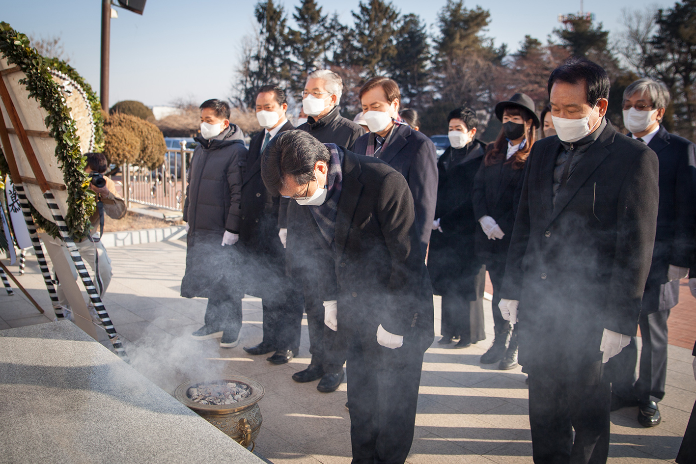 더불어민주당 충북도당(위원장 : 이장섭 국회의원)이 임인년 새해를 맞아 3일 청주시 사직동 충혼탑에서 참배식을 가졌다.