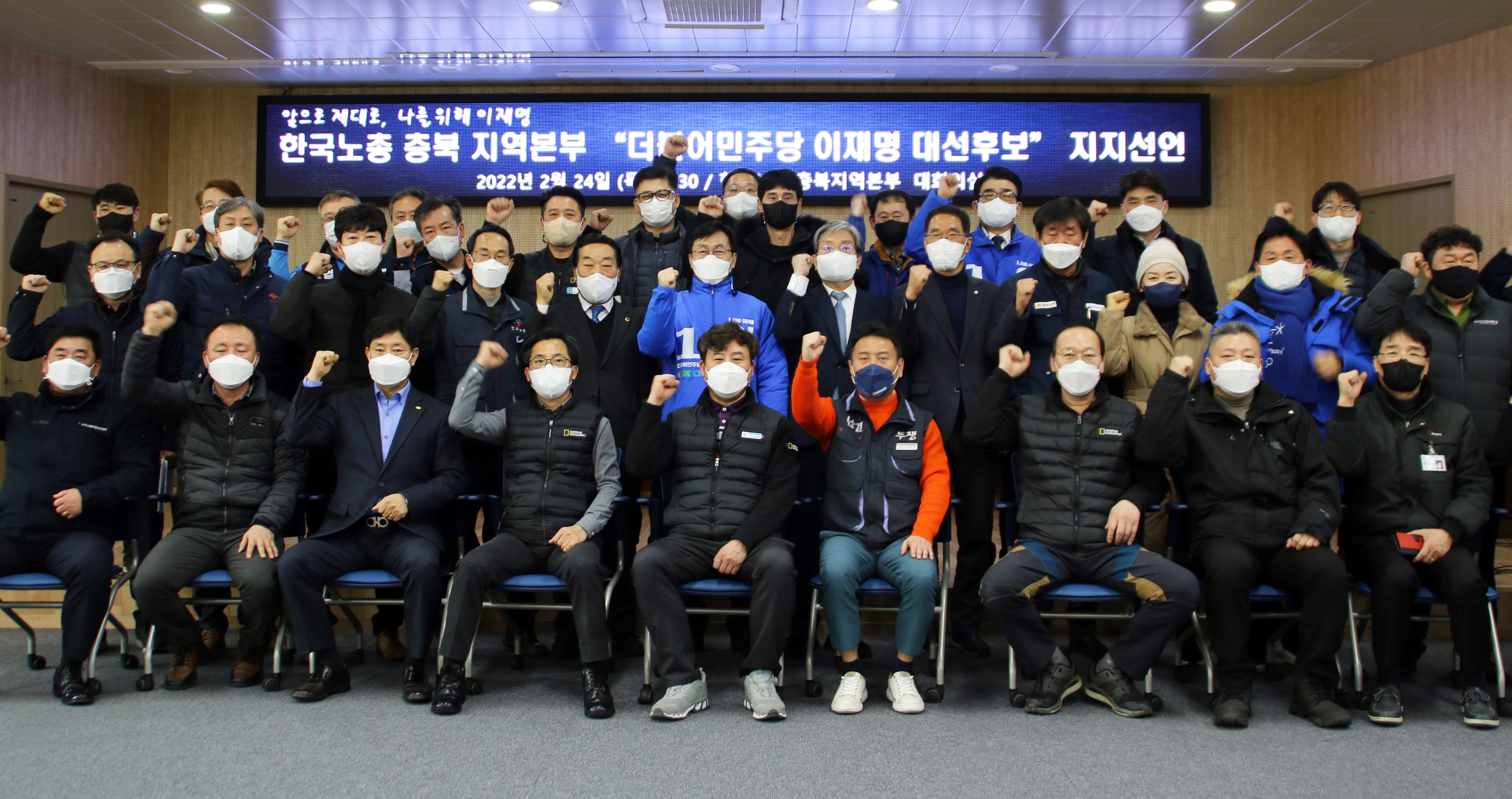 더불어민주당 충북도당은 한국노총 충북지역본부 이재명 후보 지지선언 행사가 24일 오후 한국노총 충북지역본부 대회의실에서 열렸다고 밝혔다.