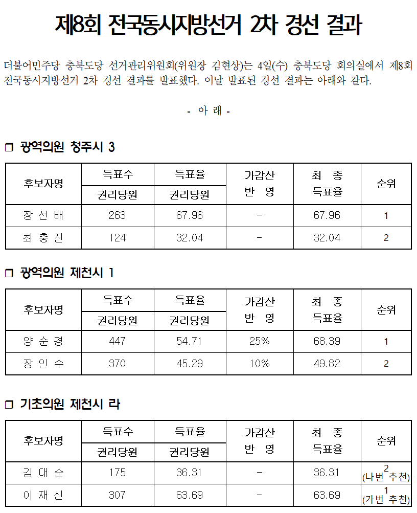 [보도자료] 제8회 전국동시지방선거 2차 경선 결과
