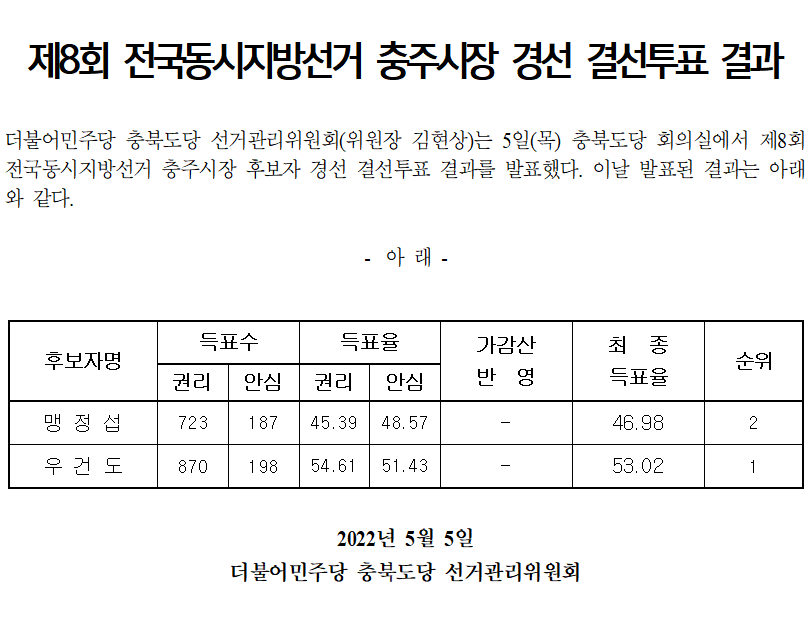 [보도자료] 제8회 전국동시지방선거 충주시장 경선 결선투표 결과