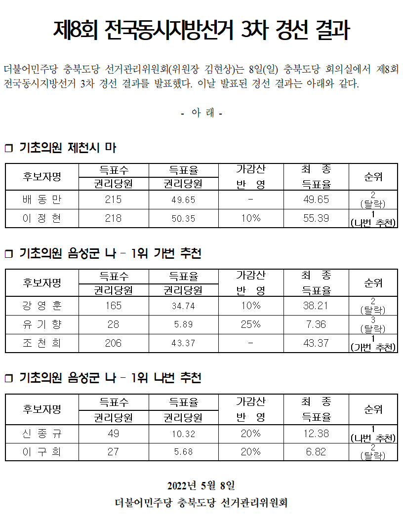 [보도자료] 제8회 전국동시지방선거 3차 경선 결과