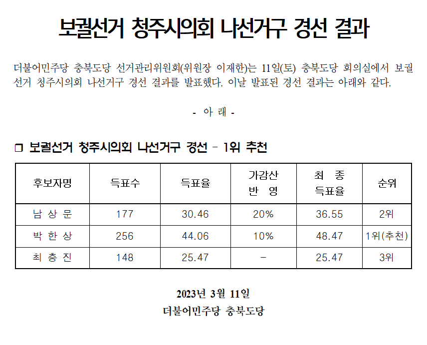 [보도자료] 보궐선거 청주시의회 나선거구 경선 결과