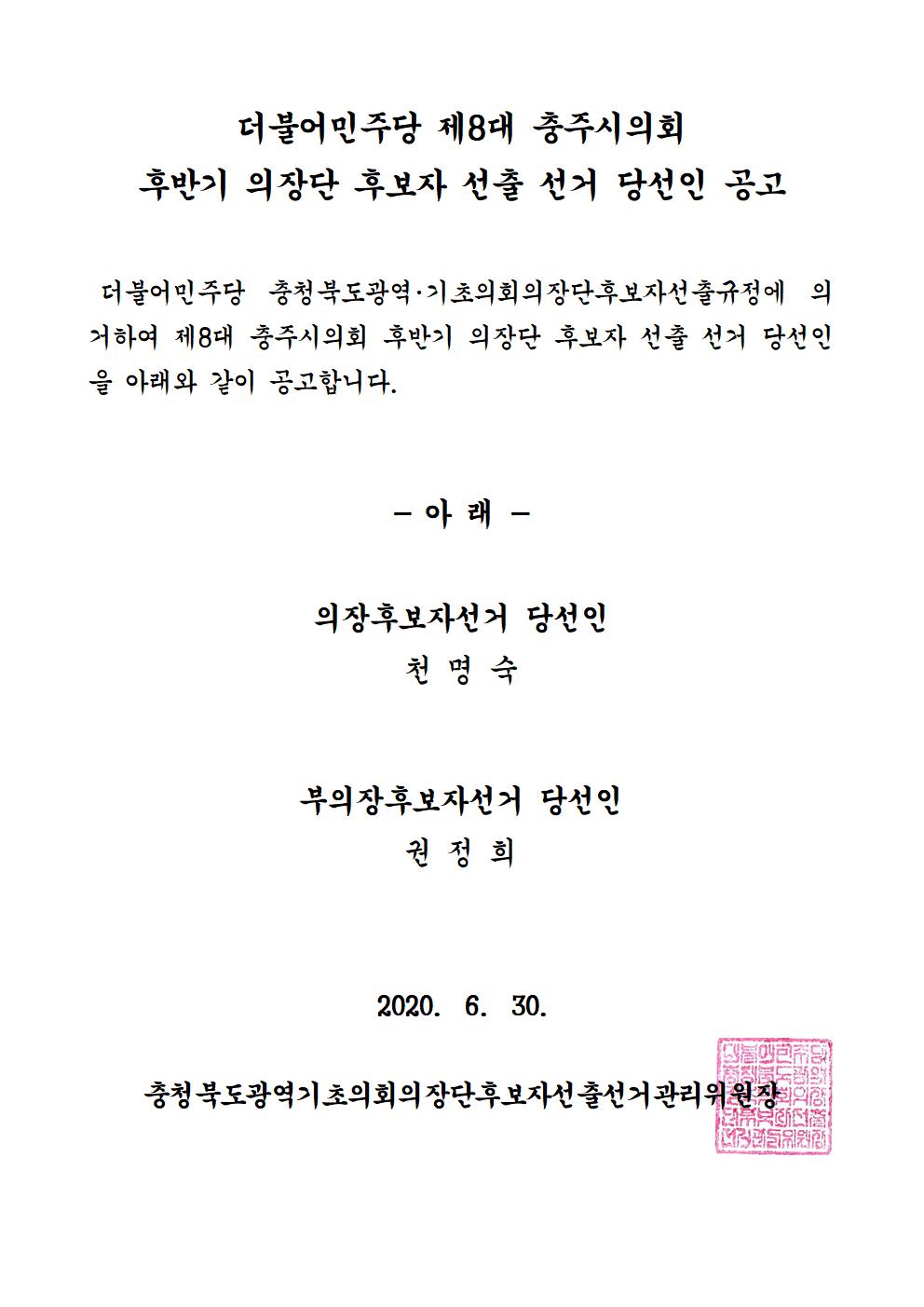 더불어민주당 제8대 충주시의회 후반기 의장단 후보자 선출 선거 당선인 공고