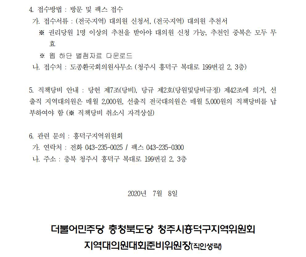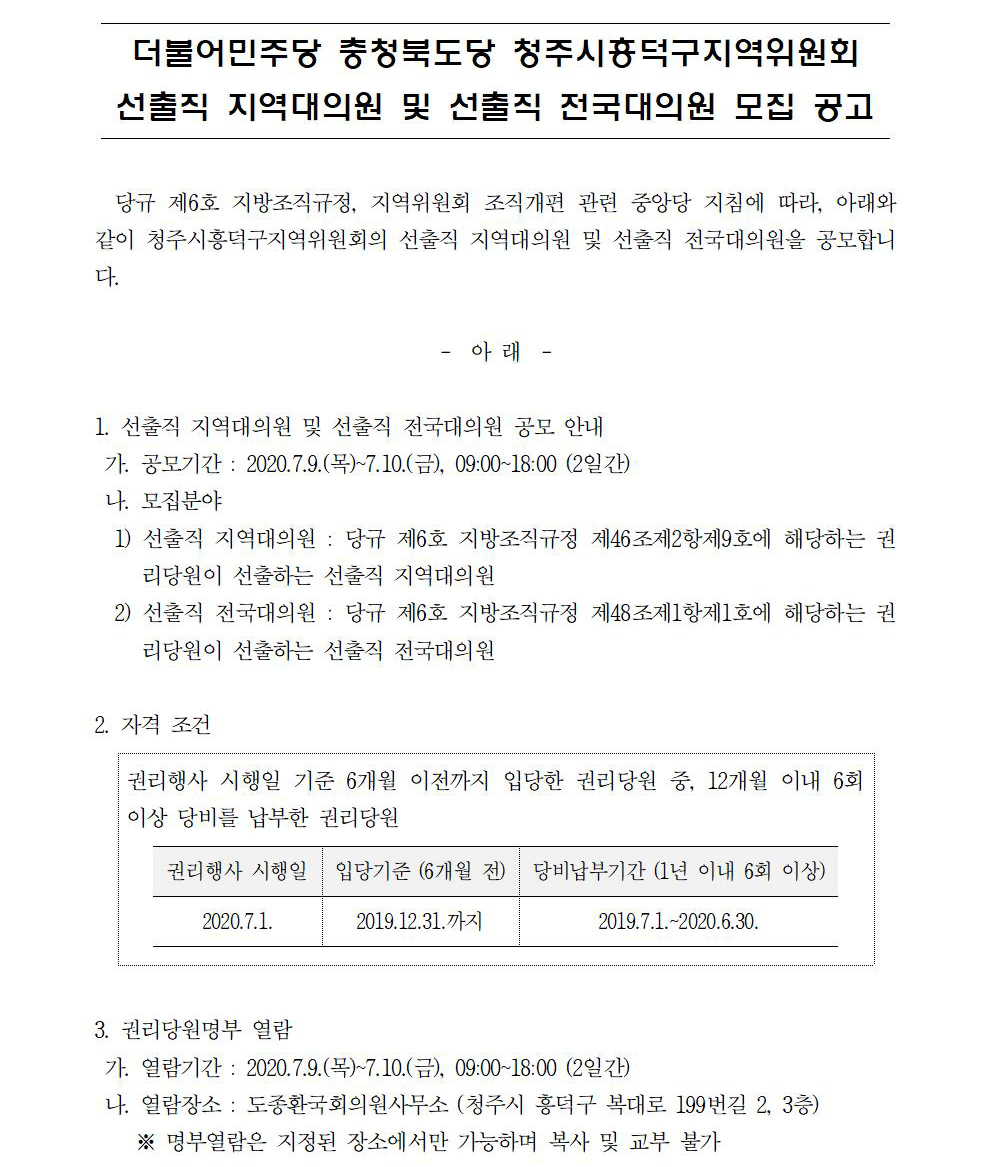 더불어민주당 충청북도당 청주시흥덕구지역위원회 선출직 지역대의원 및 선출직 전국대의원 모집 공고