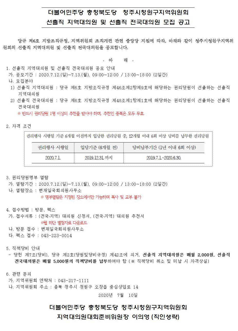 더불어민주당 충청북도당 청주시청원구지역위원회 선출직 지역대의원 및 선출직 전국대의원 모집 공고