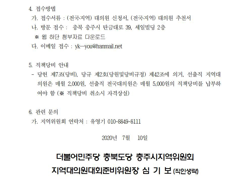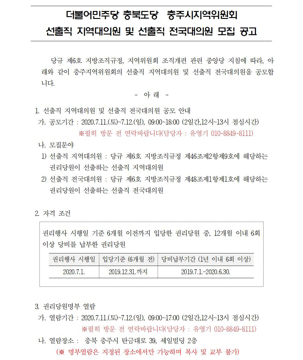 더불어민주당 충북도당 충주시지역위원회 선출직 지역대의원 및 선출직 전국대의원 모집 공고