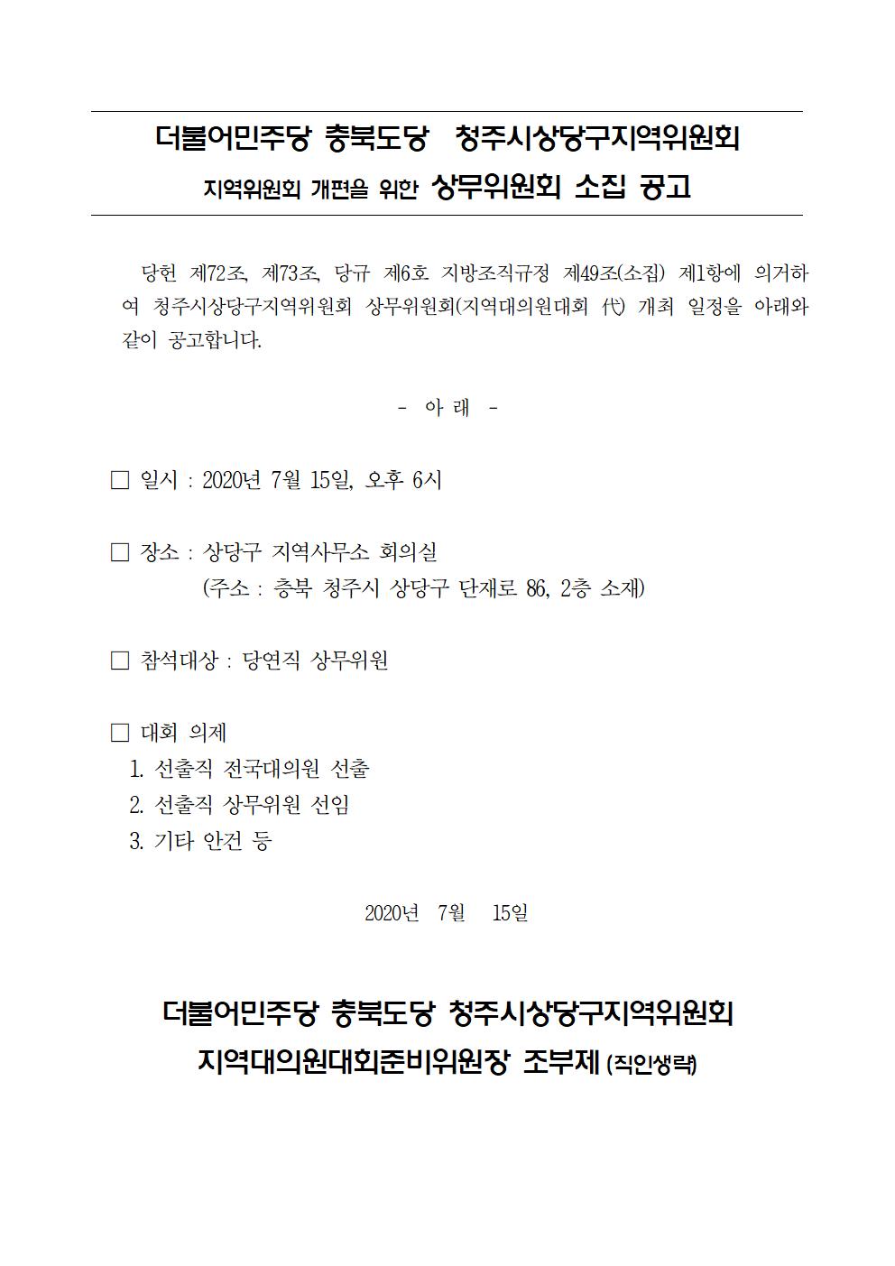 더불어민주당 충북도당 청주시상당구지역위원회 지역위원회 개편을 위한 상무위원회 소집 공고