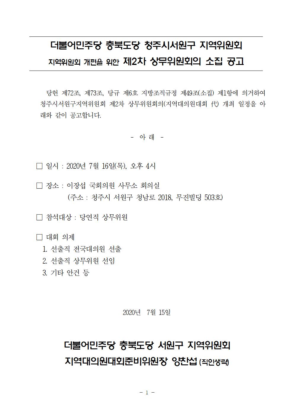 더불어민주당 충청북도당 청주시청원구지역위원회 지역위원회 개편을 위한 제2차 상무위원회의 소집 공고