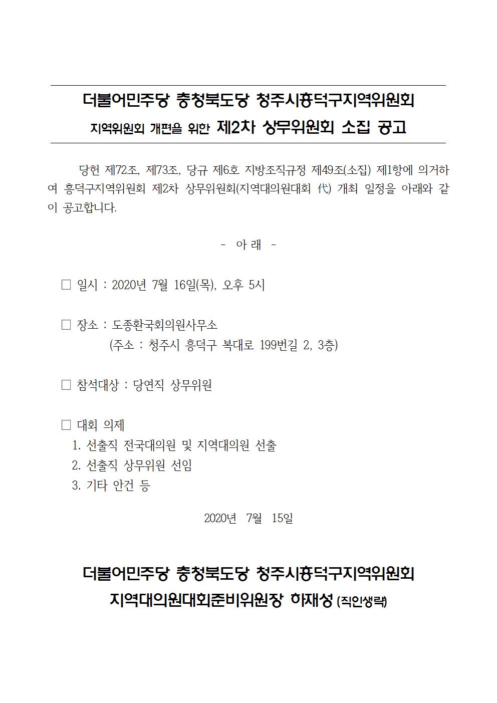 더불어민주당 충청북도당 청주시흥덕구지역위원회 지역위원회 개편을 위한 제2차 상무위원회 소집 공고