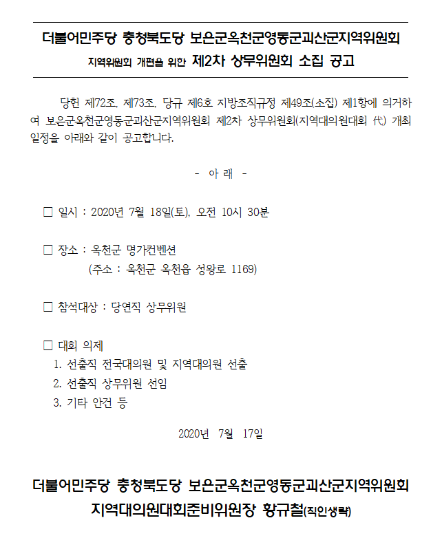 더불어민주당 충청북도당 보은군옥천군영동군괴산군지역위원회 개편을 위한 제2차 상무위원회 소집 공고