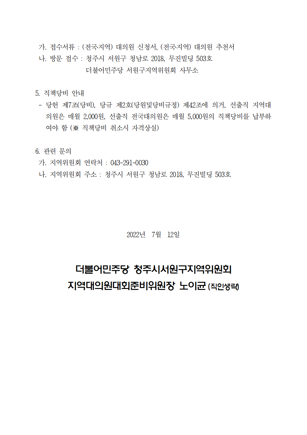 청주시서원구지역위원회 선출직 지역대의원 및 선출직 전국대의원 모집 공고