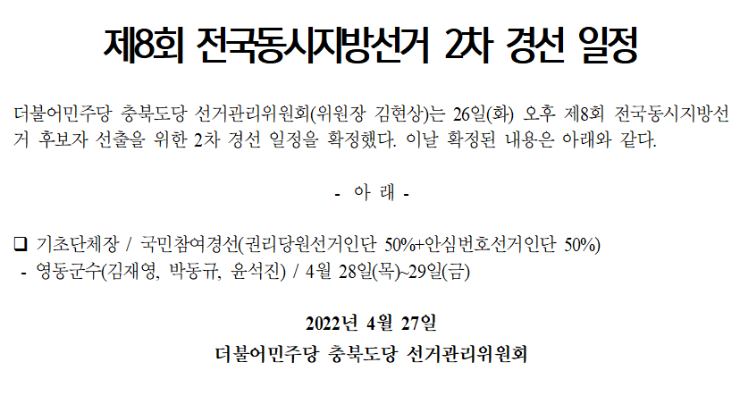 [보도자료] 제8회 전국동시지방선거 2차 경선 일정