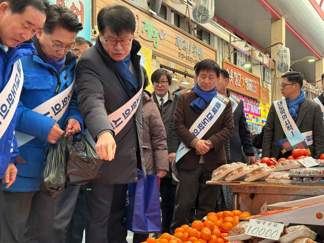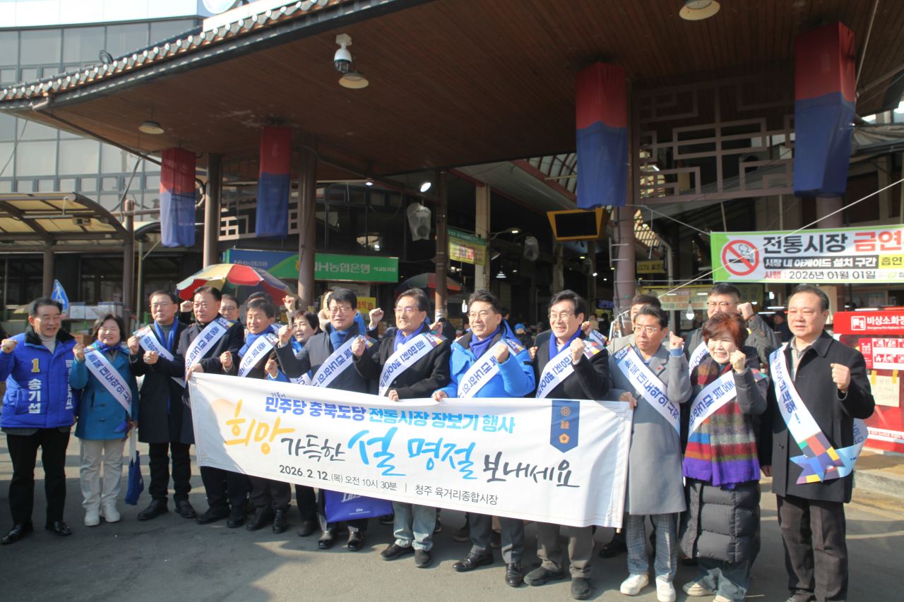 더불어민주당 충북도당(위원장 직무대행 임호선 국회의원)이 12일 오전 청주시 상당구 육거리시장에서 ‘설 맞이 전통시장 장보기 행사’를 열고 민생 현장을 살폈다.